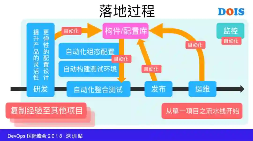 而他们的落地过程是这样子的,首先挑了其中一个项目开始,从流水线改进,第一个改进和他们构件和配置有关,从建立共用配置库开始,然后从自动化发布入手,之后发布就是统一集中送进构件库。