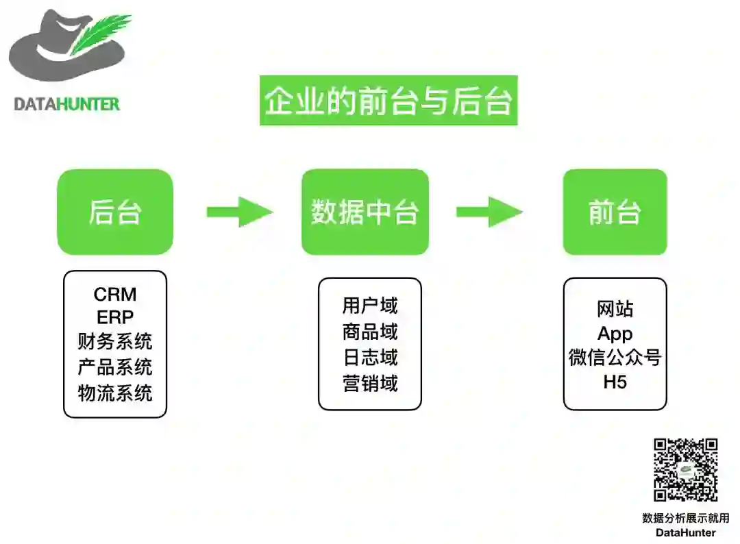 前台是由各个应用组成的前端系统平台。前端系统直接触达用户,通过前台,企业与最终用户直接进行信息交互。例如,企业搭建的电子商务网站、门户网站、手机APP、微信公众号等都属于前台。后台是由各个业务管理系统组成的后端平台。每个后台业务系统管理了企业的一块业务,例如,财务系统、产品系统、客户管理系统、仓库物流管理系统等。基础设施、存储和计算平台作为企业的核心计算资源,也属于后台的一部分。