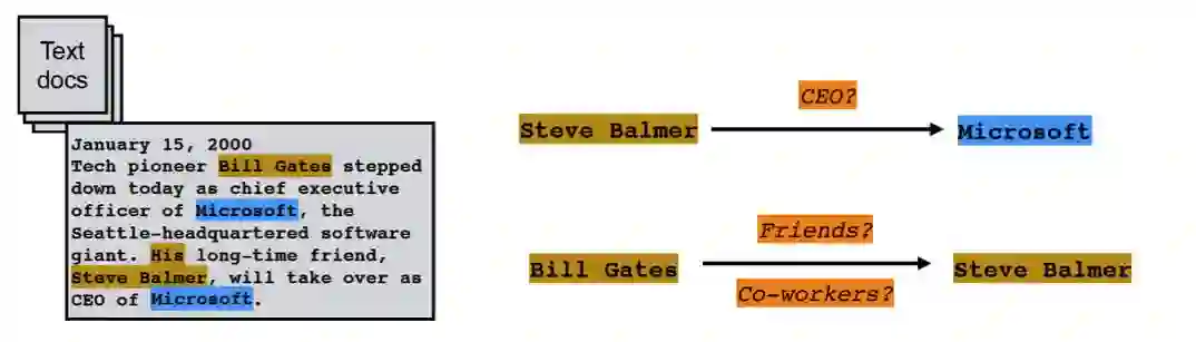 文本语料经过实体抽取之后,得到的是一系列离散的命名实体,为了得到语义信息,还需要从相关语料中提取出实体之间的关联关系,通过关系将实体联系起来,才能够形成网状的知识结构。这就是关系抽取需要做的事,如下图所示。