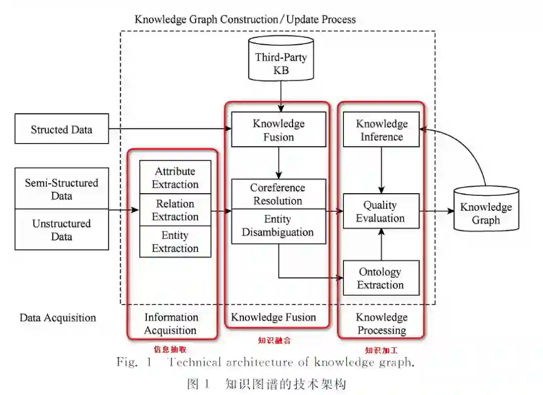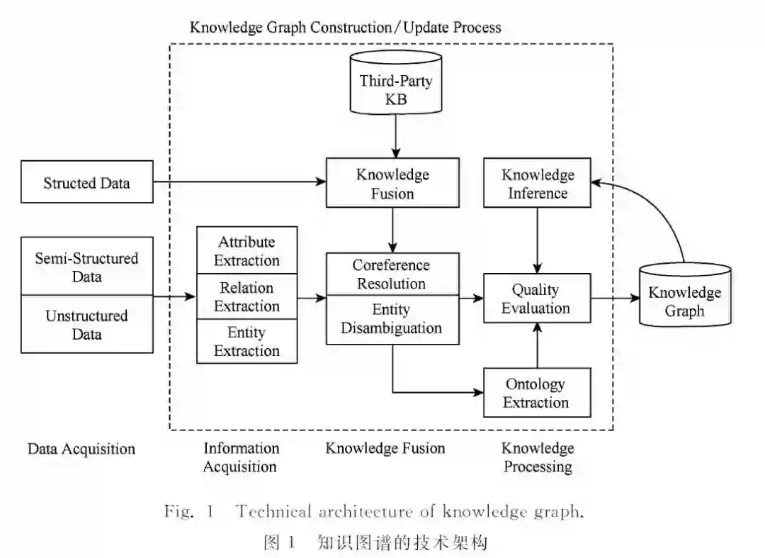 知识图谱的整体架构如图所示,其中虚线框内的部分为知识图谱的构建过程,同时也是知识图谱更新的过程。