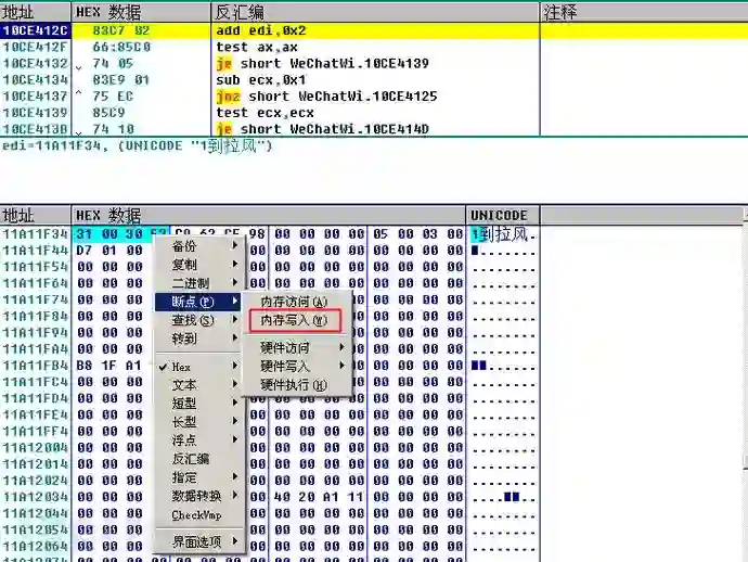 OD挂载Wechat.exe进程后,在左下角内存窗口处Ctrl+G,输入找到的MsgAddr(11A11F34)回车,定位到该数据,然后再HEX数据处,右键弹出菜单,选择断点->内存写入。