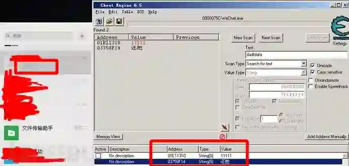 那么,先用CE(First Scan)搜索当前搜到的消息内容,找到可能的内存地址。多次接受不同消息后,Next Scan按钮搜索每次新的消息内容,最终确定聊天列表中显示的最新消息内容的内存地址。