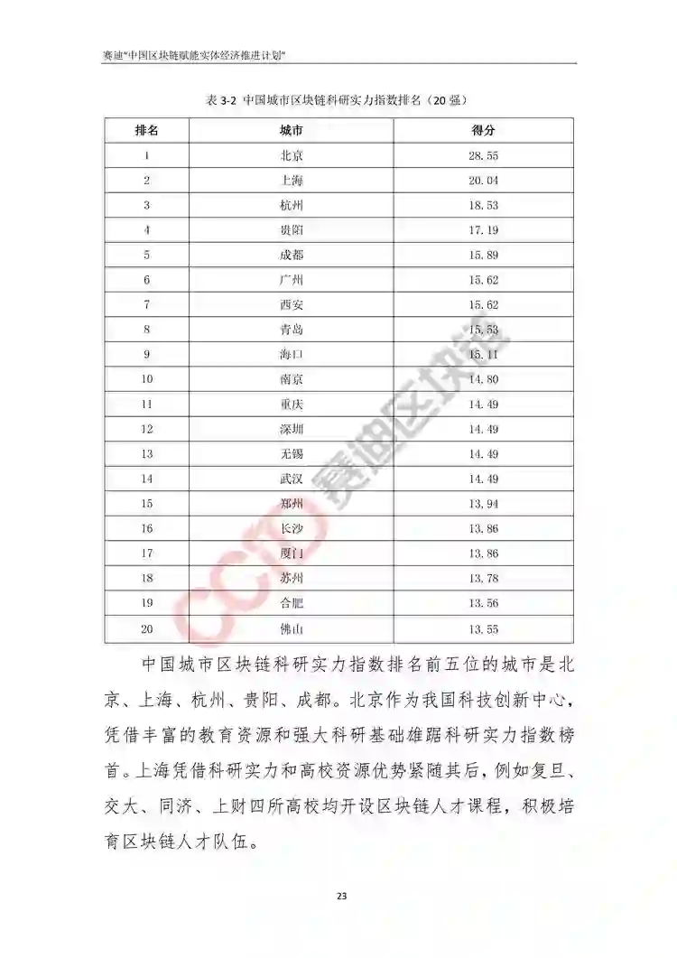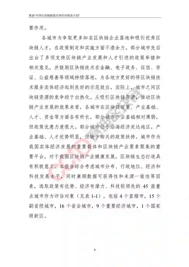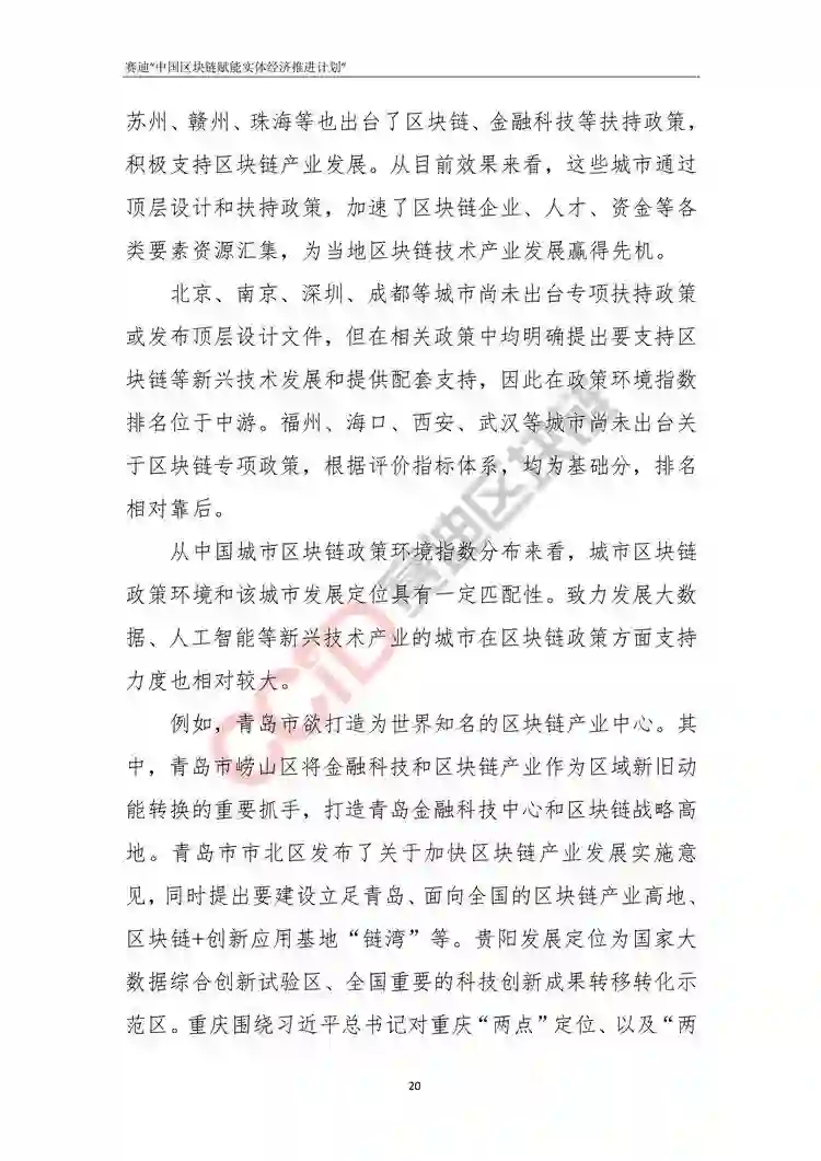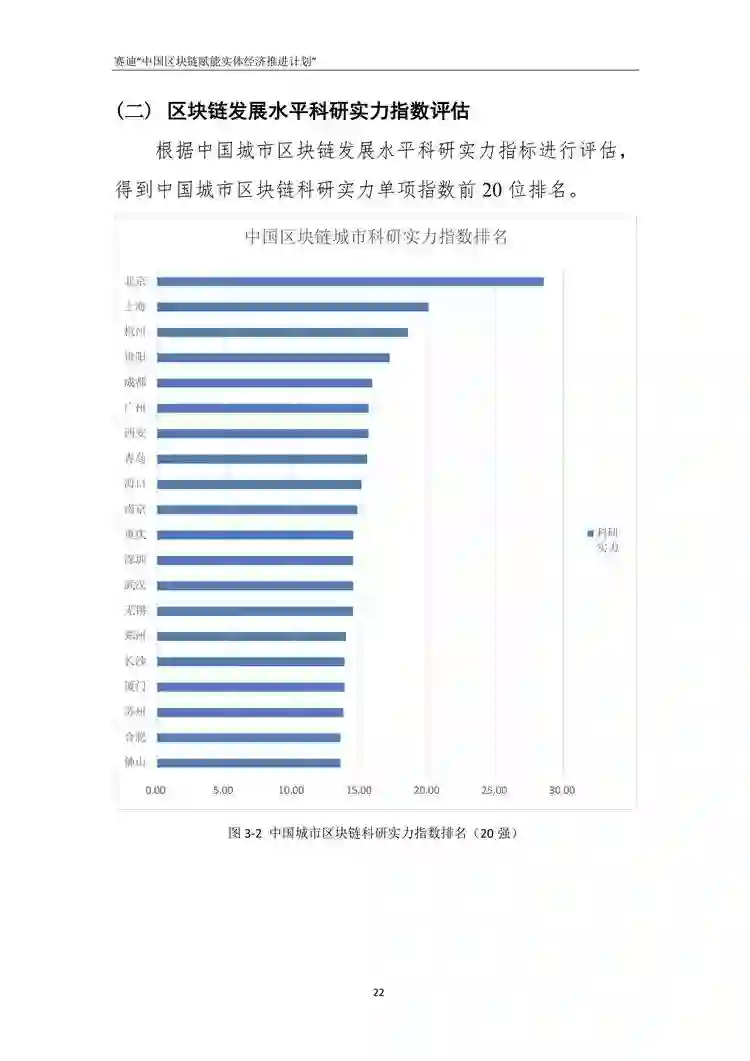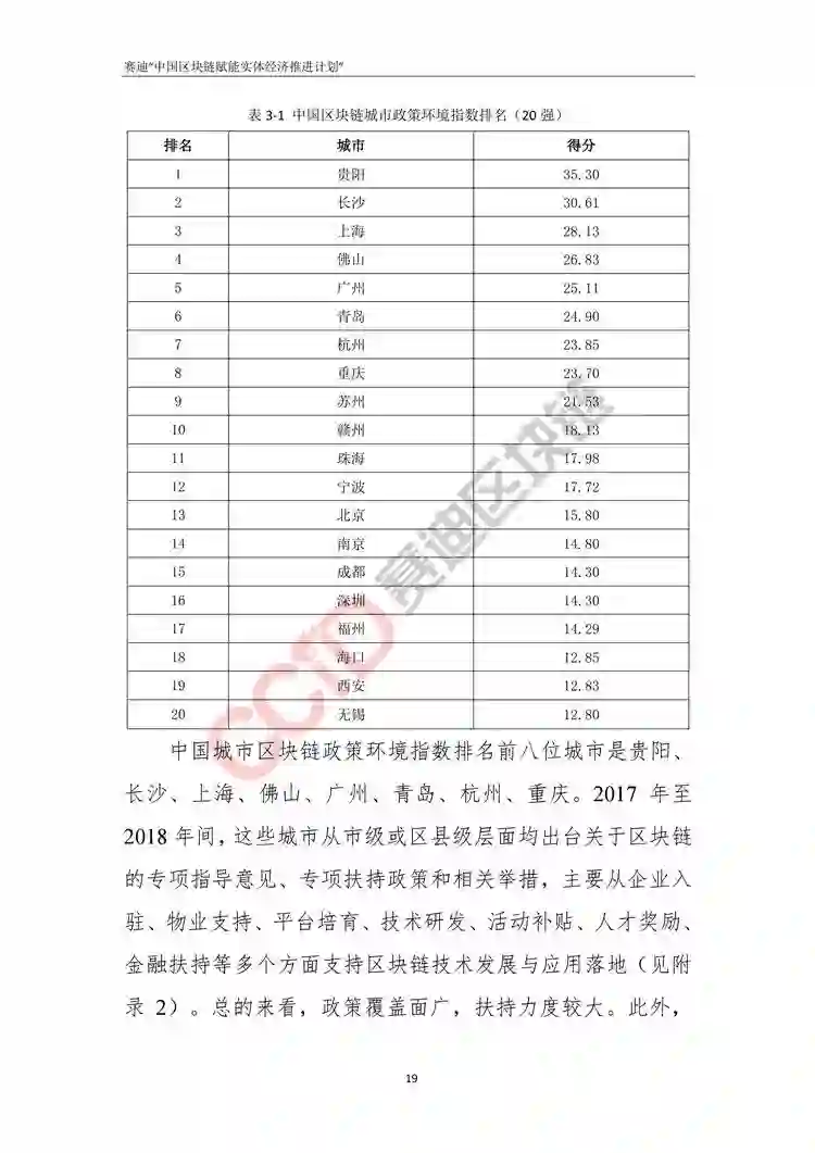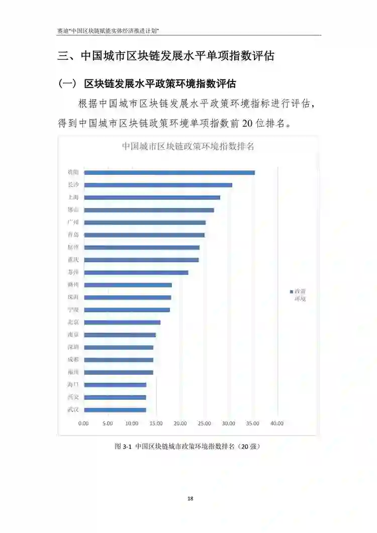 2018年12月7日,赛迪(青岛)区块链研究院发布了《中国城市区块链发展水平评估报告(2018年)》,报告从政策环境、科研实力、产业基础、资本支持四个方面对中国45座重点城市的区块链发展水平进行评估,并评选出中国城市区块链发展25强。