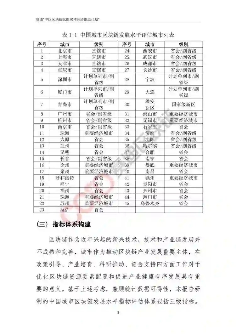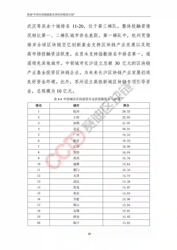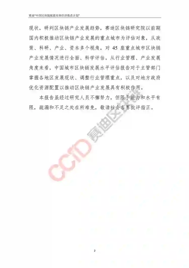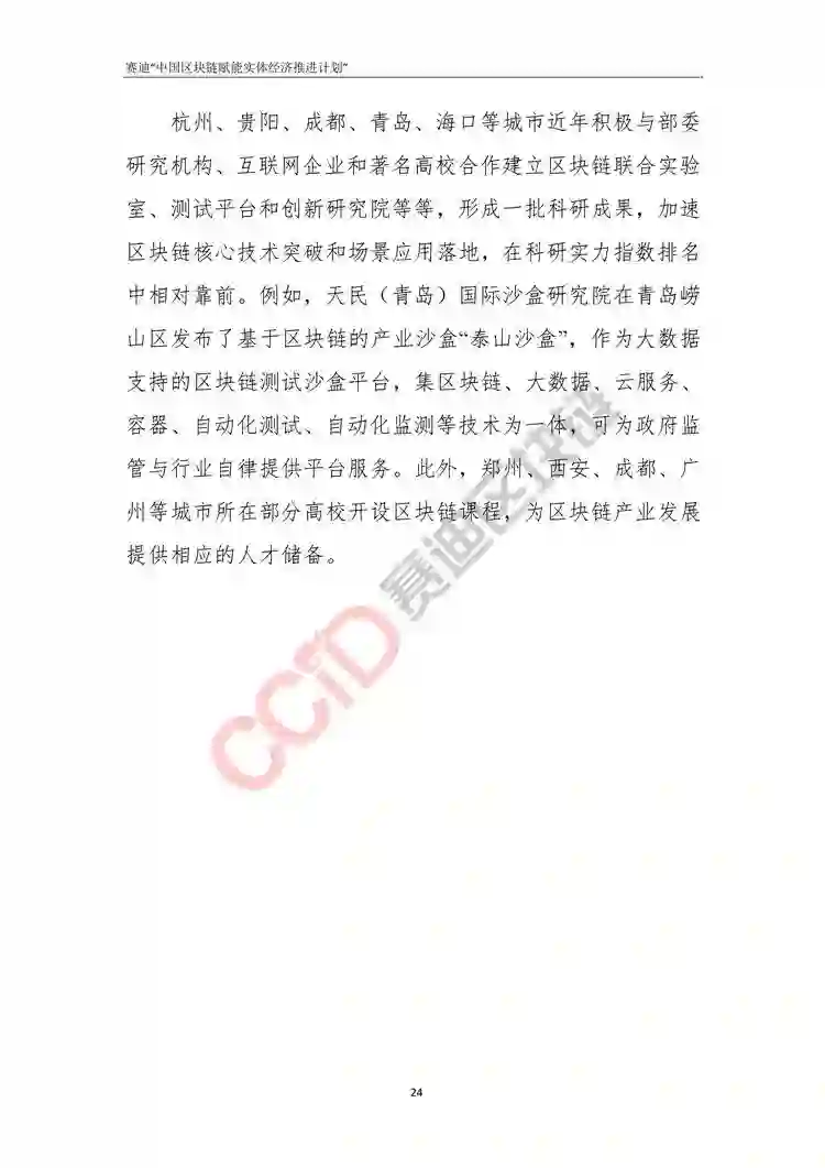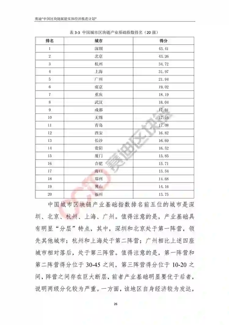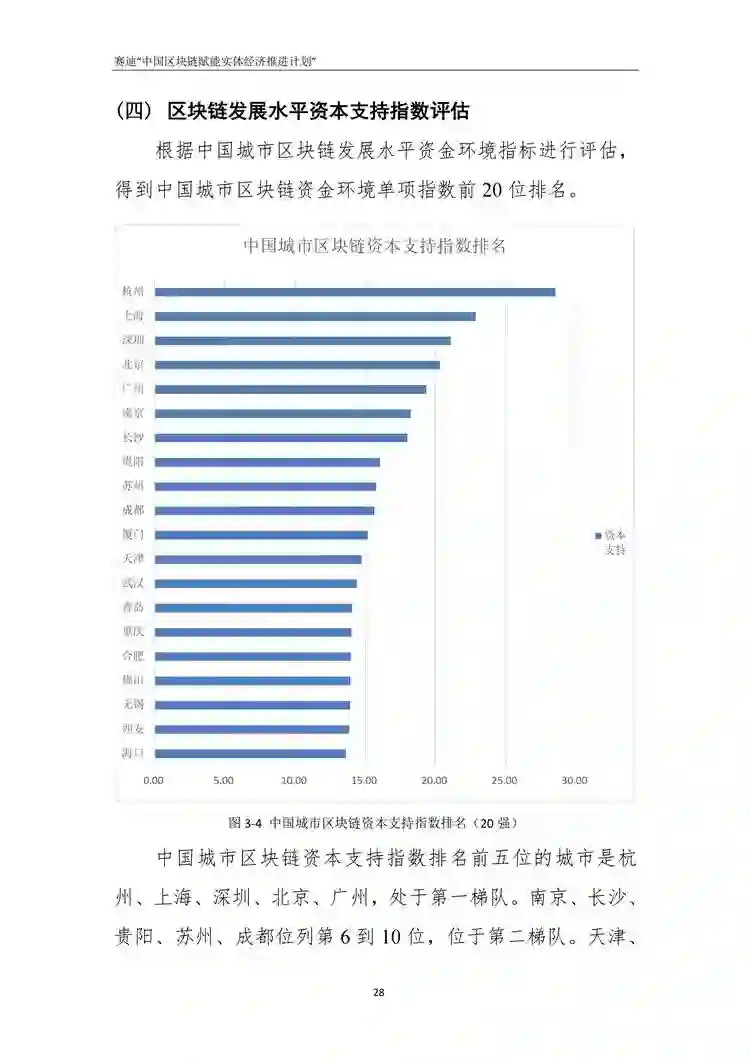2018年12月7日,赛迪(青岛)区块链研究院发布了《中国城市区块链发展水平评估报告(2018年)》,报告从政策环境、科研实力、产业基础、资本支持四个方面对中国45座重点城市的区块链发展水平进行评估,并评选出中国城市区块链发展25强。