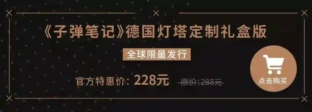 普通版灯塔子弹笔记本的官方售价最低为293元,而这套《子弹笔记》限量礼盒装,除了包含《子弹笔记》礼盒定制款笔记本外,还包含全球同步发行的《子弹笔记》中文版和子弹笔记本使用指南,仅需288元,首发购买只需228元。