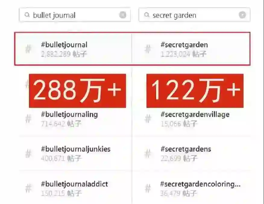 社交媒体Instagram上和“子弹笔记”有关的晒图超过288万,是“秘密花园”热度的2倍多,而且数字还在持续刷新!
