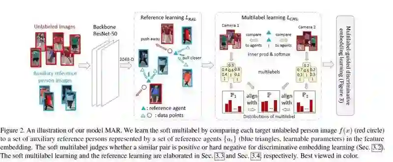 相对于有监督行人重识别(RE-ID)方法,无监督 RE-ID 因其更佳的可扩展性受到越来越多的研究关注,然而在非交叠的多相机视图下,标签对(pairwise label)的缺失导致学习鉴别性的信息仍然是非常具有挑战性的工作。为了克服这个问题,我们提出了一个用于无监督 RE-ID 的软多标签学习深度模型。该想法通过将未标注的人与辅助域里的一组已知参考者进行比较,为未标注者标记软标签(类似实值标签的似然向量)。基于视觉特征以及未标注目标对的软性标签的相似度一致性,我们提出了软多标签引导的 hard negative mining 方法去学习一种区分性嵌入表示(discriminative embedding)。由于大多数目标对来自交叉视角,我们提出了交叉视角下的软性多标签一致性学习方法,以保证不同视角下标签的一致性。为实现高效的软标签学习,引入了参考代理学习 (reference agent learning)。我们的方法在 Market-1501 和 DukeMTMC-reID 上进行了评估,显著优于当前最好的无监督 RE-ID 方法。