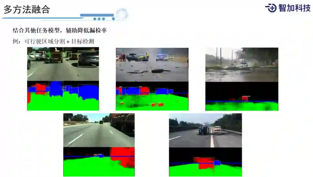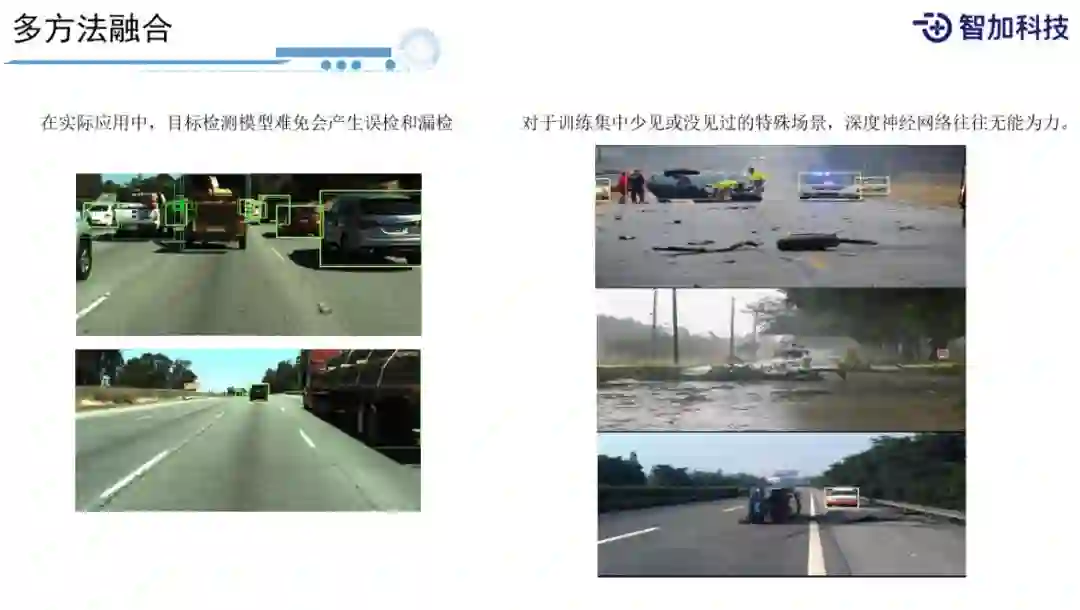 在实际应用中,目标检测模型难免会产生误检和漏检,如左图中的皮卡和卡车很明显就被漏掉了。另外,对于训练集少见或没见过的特殊场景,深度神经网络往往无能为力,一旦出现这种情况,往往非常危险。对应的,我们的思路是:
