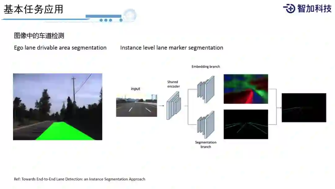 Demo是我们用分割模型做的Ego lane drivable area segmentation;上图右侧是我们做的instance level lane marker segmentation,网络结构如图所示,它是一个encoder decoder based,然后做一个segmentation branch和一个embedding branch,最后将2个结果合起来。