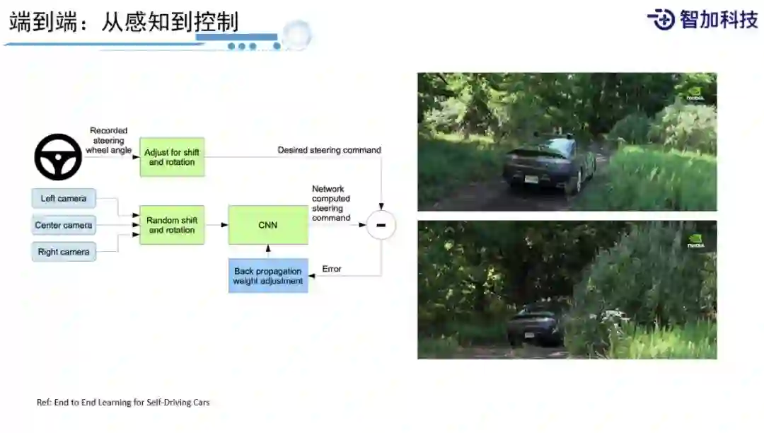 16年的时候,英伟达研究了end to end神经网络,左侧输入左中右三个Camera的image,直接通过CNN输出转向的指令。如demo截图中,测试人员把手伸出了天窗,表示他没有操控车辆,然后车辆自动实现转向。不过这种方式存在2个隐患: