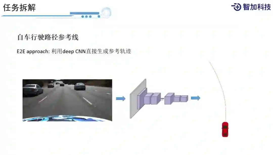 我们在做Planning时,我们需要做一个自己车本身轨迹的参考线,以其为参考生成最终的轨迹,并且做一些速度的规划。如果我们没有高精地图,我们可能会采用E2E approach的方法,感知到一张图片之后利用deep CNN直接生成参考轨迹(如上图最右侧),这样单独的参考线通常是不能用的。所以我们需要把任务进行拆解。