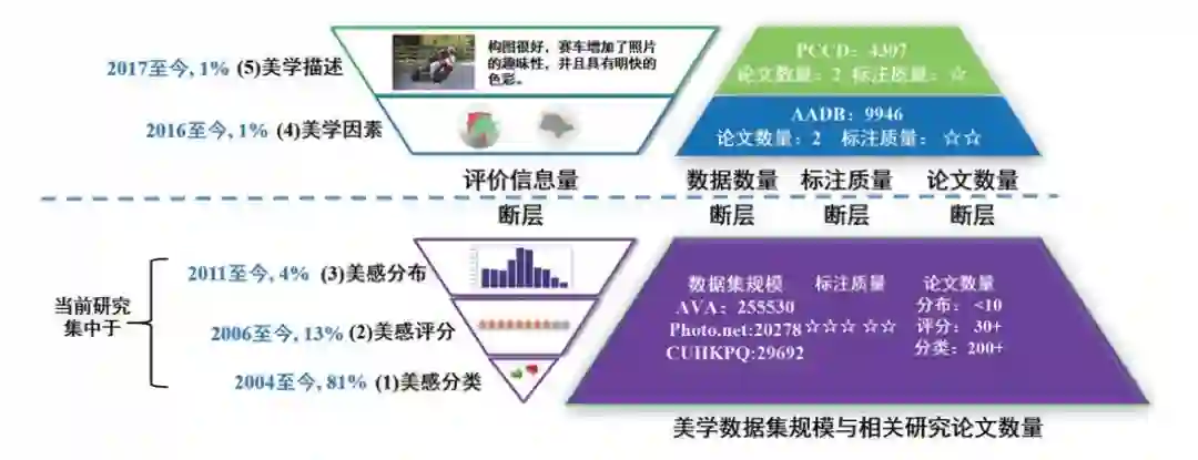 1)美学评价5层模型与其对应的数据量和研究论文数量总体成倒三角形分布:层级越高,目前的数据量和论文数量越少,标注质量越低。