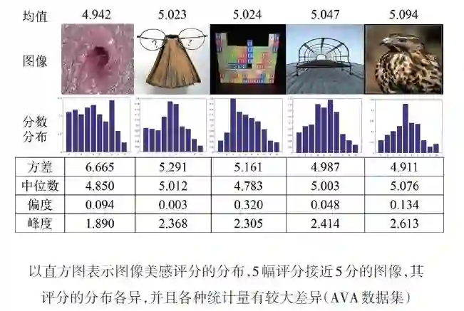 图像美感分类与评分,本质上是利用1个标量来表示图像的美感,这在很大程度上忽略了人类审美在一定共识上的多样性、主观性、个性化,这也是美学评价与一般图像识别最大的差别,一般的图像识别几乎都有标准答案,共识率很高,产生争议的图像较少。图像美学评分的概率分布能在一定程度上描述审美的主观性,例如方差能够在一定程度上描述人类对一幅图像的共识度,峰度能够在一定程度上描述一幅图像的受欢迎程度等,如图6所示。