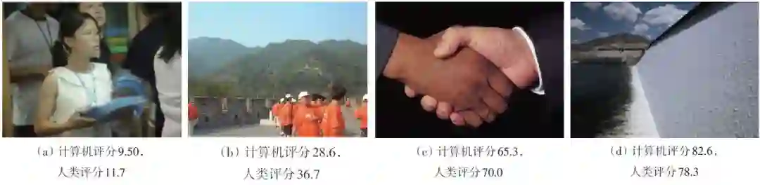 2004年,微软亚洲研究院与清华大学自动化系联合提出了一种方法,能够自动区分专业摄影师拍摄的照片与普通用户拍的照片,该项工作被认为是图像美学质量评价最早的一篇论文,研究者收集了16643幅专业摄影师拍摄的照片,以及12897幅普通用户拍摄的照片,使用了21类共846维图像低层特征学习分类模型,从而对测试图像进行美感分类。此外,研究者还收集了379幅图像,每一幅图像请16名测试者(8名男性与8名女性)根据图像美感进行评分(1~5档:差、不好、中等、好、卓越),将每幅图像的平均得分作为其真实的人类评分数据,由此学习回归模型,能够对测试图像进行美感评分,如图4所示。