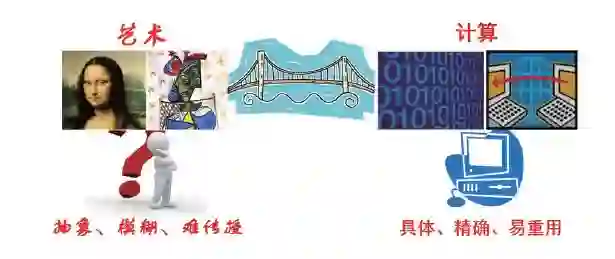 感知和创作具有美感的艺术作品的经验知识需要通过较长时间的训练,艺术具有抽象、模糊、难传授等特点,而计算具有具体、精确、易重用等特点,如图2所示。在物质生活日益丰富的今天,需要为人们提供创造美的便捷工具。如果使计算机或机器人完成艺术创作中的大量非创造性体力劳动,就能够使得人类更好地集中精力发挥创作才能,从而使得更多的人能够创作以前只有专业艺术家才能创作的艺术作品,这首先需要计算机能够识别“美”。