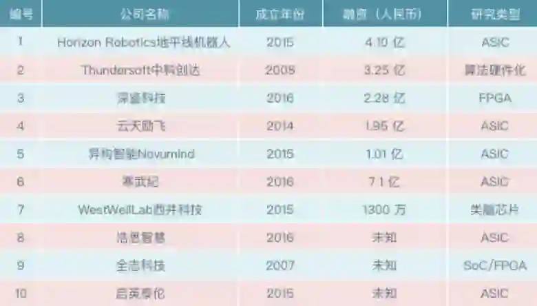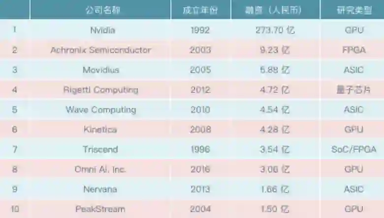 在中美总融资TOP10 公司中,中国以ASIC和FPGA为主,类脑芯片其次,占据1个席位;美国光GPU就有4家之多,剩下6席分别被FPGA和ASIC平分,值得注意的是Rigetti Computing这家公司,自2012年起开始研发量子芯片,颇受关注,吸纳到一共6笔,总计4.72亿元的融资。
