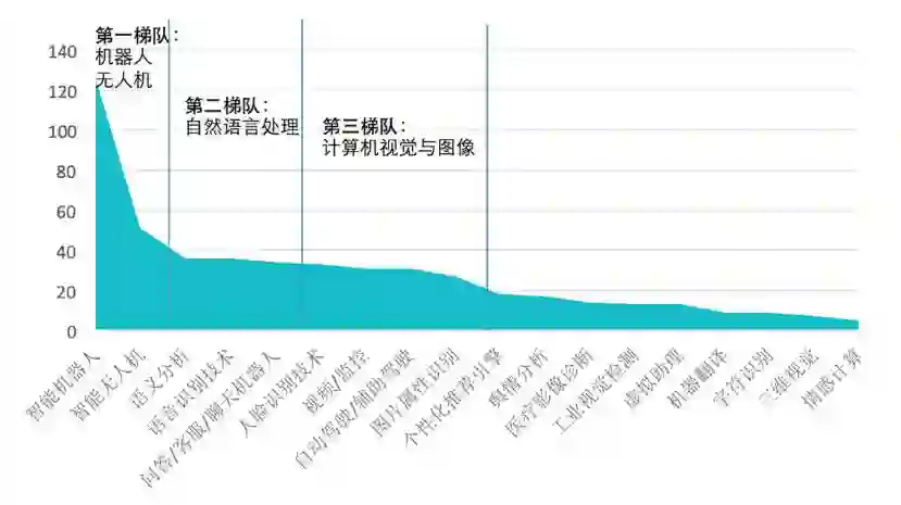 根据《2017年中美人工智能创投现状与趋势研究报告》统计数据,国内智能机器人与无人机相关技术创业最为火爆,位居于第一梯队;语义分析、语音识别、聊天机器人等自然语言系列的技术位列第二梯队;第三梯队则为人脸识别、视频/监控、自动驾驶、图像识别等计算机视觉系列的技术;另外,情感计算这种综合了心理学、语义、视觉、环境感知等多种技术的复杂应用技术也在慢慢成长中,这类企业正在尝试产业的探索与创新,前景广阔,但是目前处于热度排行末端。