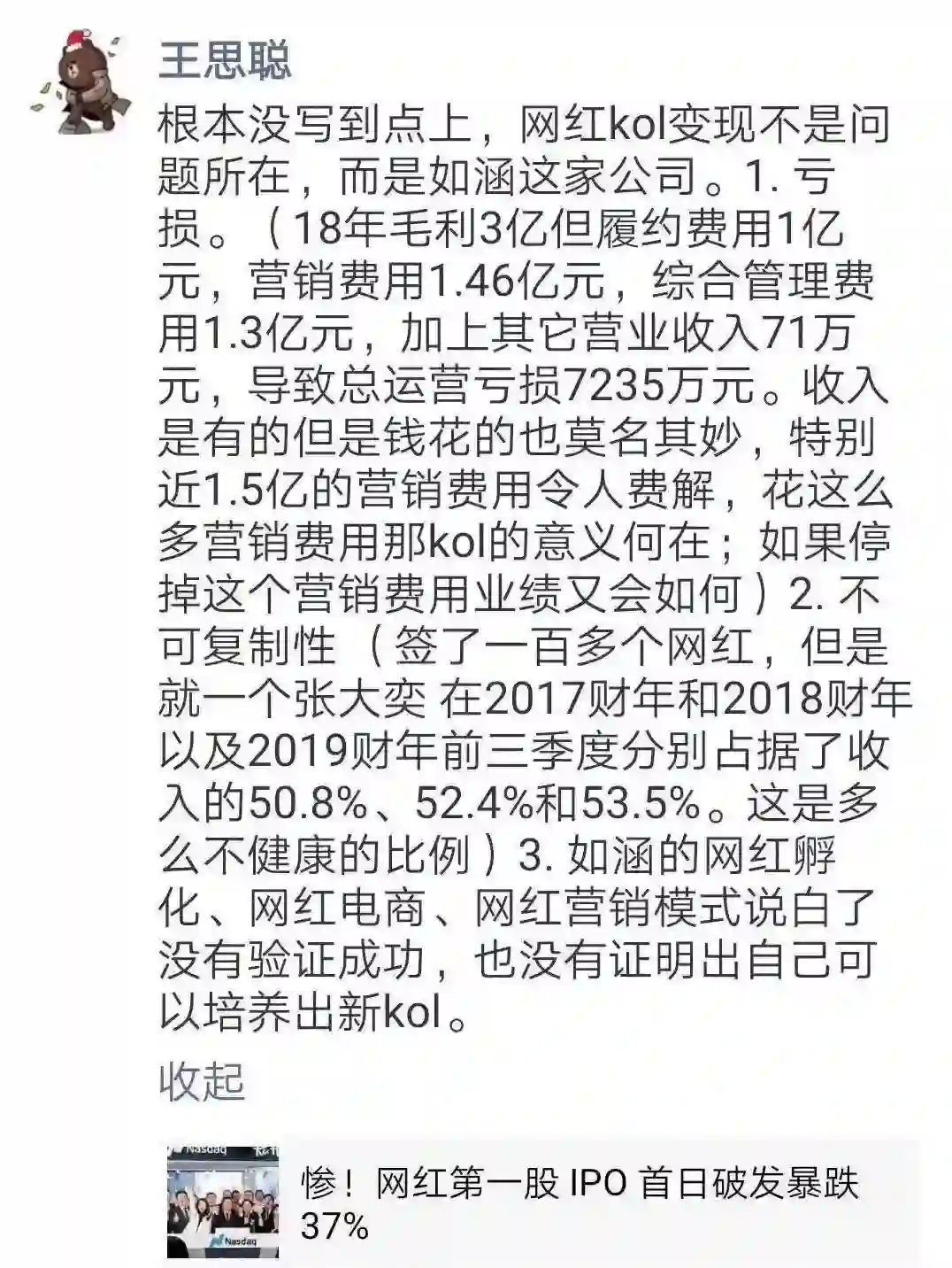 中概股近年来在美股市场的破发案例时有发生,但像如涵这样刚上市不久就腰斩的惨状也确实罕见。媒体和业内人士普遍将如涵不被美股投资者看好的原因,归结为“变现模式单一”、“过分依赖头部网红”等等,而素来对网红经济有所涉猎的王思聪此前也在朋友圈发表了自己的看法。
