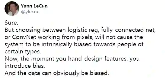 在7年前,大多数机器学习系统使用手工特征,这是偏见的主要来源。但是现在,人们开始使用深度学习架构,很大程度上减少了源于特征选择和架构设计的偏见。所以我才认为现在数据是主要的偏见来源。我不是在讨论机器学习理论性质上的归纳偏置(这是独立于数据的)。我所讨论的是现在在机器学习系统中经常见到的偏见,这些偏见可能源于特征或数据。但如果特征是用深度学习学到的,那么偏见不应该主要存在于数据吗?”