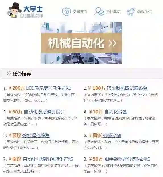 大学士(http://www.dxueshi.com/)是一个可以利用技术专长网上接项目的平台,通过大学士网挑选国内企业提供的众多制造技术项目,凭技术为企业解决困难,赚取高额报酬,充分实现自身价值。