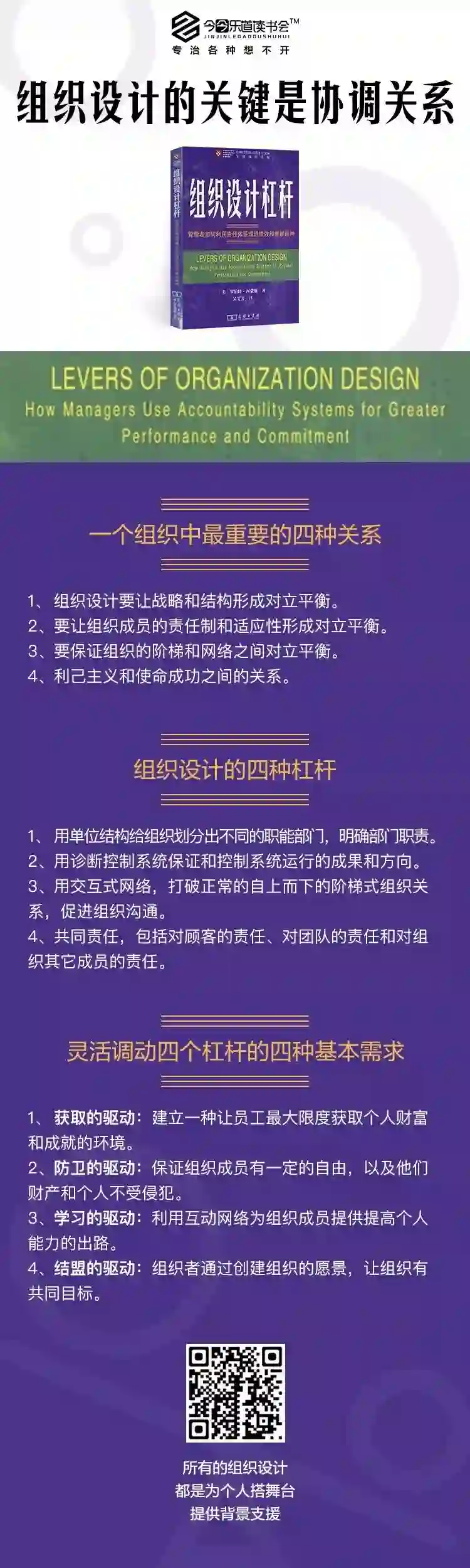 现代企业需要什么样的管理机制?企业应当如何设计才能避免各种企业病?《组织设计杠杆:管理者如何利用责任体系增加绩效和奉献精神》就是专门为大家答疑解惑的书。书中所说的组织设计,指的就是一切组织的管理结构设计,自然也包括企业管理机制设计。书中详细论述了组织设计的目的、关键要素、组织设计杠杆的作用,以及如何利用这个杠杆设计一个完善的组织结构的方法。这本书不仅是企业管理者的教科书,对其他各种机构和组织的管理者也同样具有重要的借鉴意义。