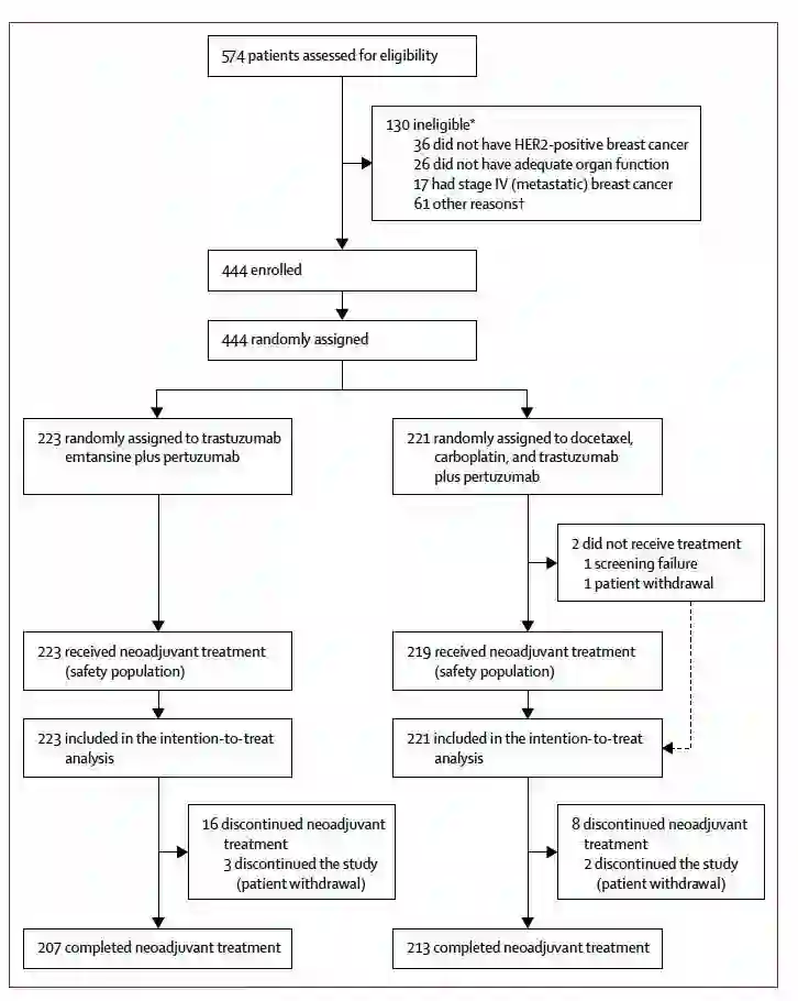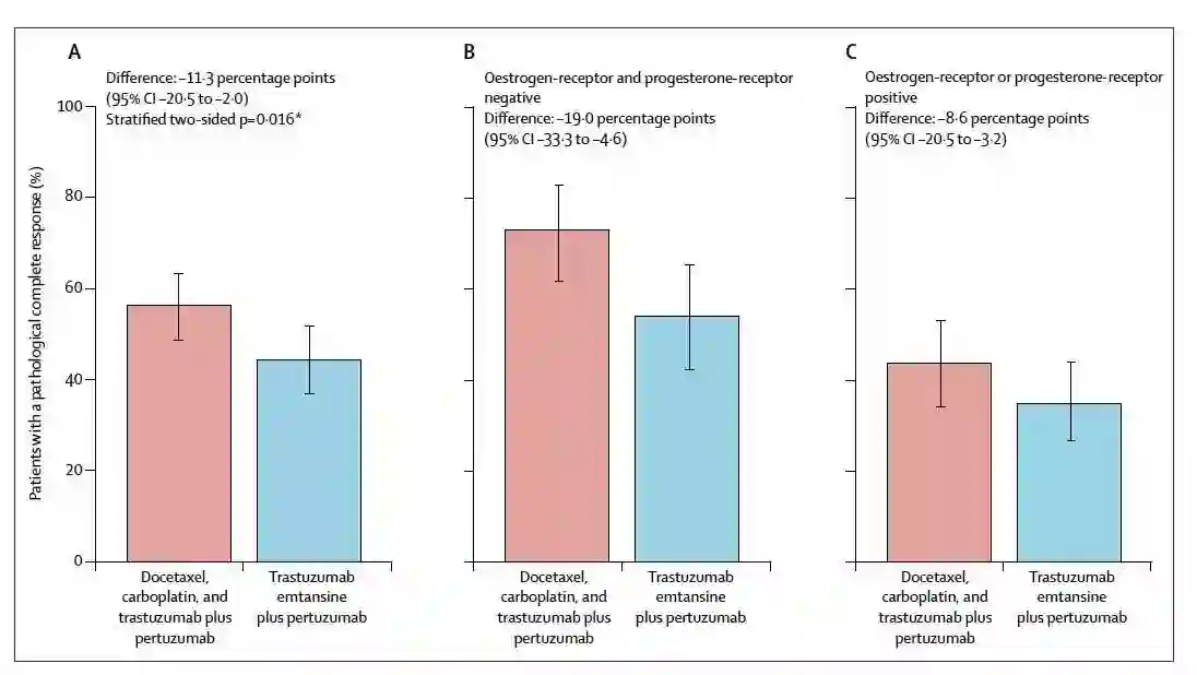 研究入组了年龄18岁或以上,可手术的,临床分期cT2-T4/cN0-3/cM0(II-III期)的乳腺癌患者(T>2cm),中心实验室确认HER2阳性(IHC3+或基因扩增)。ECOG PS评分0-1分,基线的左室射血分数(LVEF)>=55%。患者1:1随机分配至两组:1. TDM-1+帕妥珠单抗;2. 多西他赛卡铂+曲妥珠单抗+帕妥珠单抗,21天为一个周期,新辅助治疗阶段,患者共接受6个周期的治疗。分层因素包括:HR状态,临床分期(II-IIIA vs IIIB-IIIC)和地理位置。主要研究终点为各个研究中心确定的pCR率(ypT0/is, ypN0)。次要研究终点包括非炎症性乳腺癌患者接受乳腺癌保乳手术的患者比例,患者报告的生活质量和安全性评估。