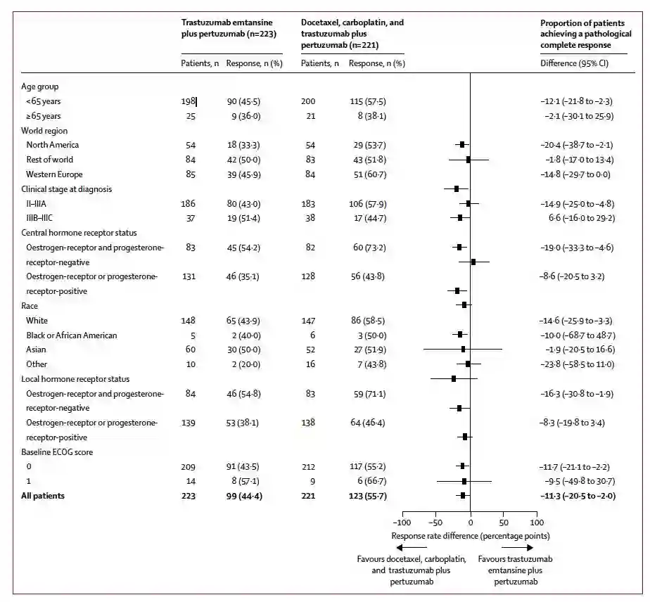 TDM-1+帕妥珠单抗组的223例患者中,达到pCR的患者共99例(44%);多西他赛卡铂+曲妥珠单抗+帕妥珠单抗组,221例患者接受治疗,达到pCR的患者123例(56%),两组对比,绝对差值为-11.3%(95%CI:-20.5~-2.0;P=0.016),见下图2.
