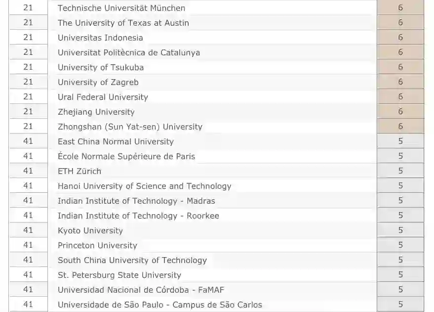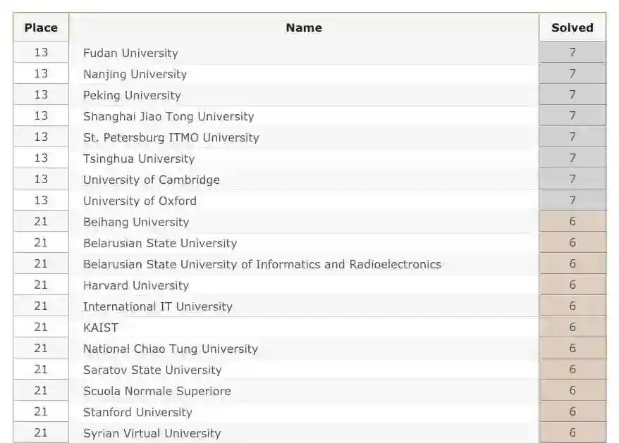 据悉,来自俄罗斯的莫斯科国立大学卫冕成功摘得桂冠。而来自中国的国立台湾大学摘得银牌,排名第五;香港中文大学摘得铜牌,排名第 12。其他入围总决赛的 17 所中国高校分别是:复旦大学、南京大学、北京大学、上海交大、清华大学(并列 13)、北航、浙大、中山大学(并列 21)、华东师范、华南理工、西安交大(并列 41)、北师大、广东工业大学、东北大学、东南大学(并列62) ,此外还有两所高校哈尔滨工业大学、南京理工大学获得荣誉奖。