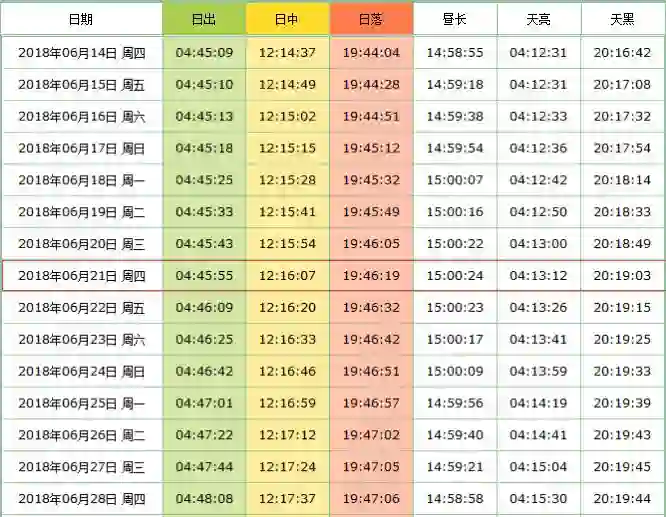 为了让你们能够更直观地理解,小编找到了北京2018年夏至前后一周的日出日落时刻表。
