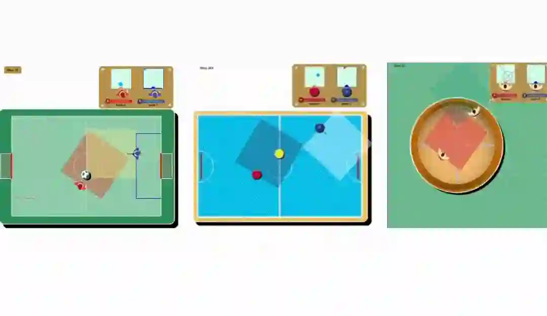 ● 整个游戏包含以下几个子游戏。在跑步中,智能体的目标是在随机选择的地图上尽快到达终点。在桌面曲棍球中,智能体的目标是通过碰撞将球打入对手的球门且防止自家球门被攻破,智能体只能在己方的场地中移动。在足球中,智能体的目标与桌面曲棍球项目相同,但是智能体能够在球场上任意活动。在相扑中,智能体的目标是避免摔下擂台并且争取将对方装撞下擂台。游戏将依次运行以上子游戏。