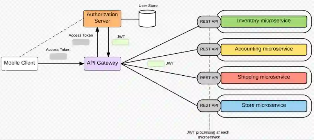 如图,这是一种采用基于令牌Token的授权方式。在这个模式下,是由授权服务器(图中Authorization Server)、API网关(图中API Gateway)、内部的微服务节点几个模块组成。