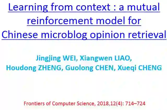 现有观点检索模型缺乏对微博中上下文语境进行有效利用。为此,提出了一种基于相互增强模型的中文微博观点检索方法。首先,构建了一个统一的三层异质图框架,有效地整合了用户社交上下文语境关系:“用户-用户”的用户间交互关系和“用户-博文/评论”的用户内部关系;然后,根据不同层次之间的相互增强关系在异质图上进行随机游走,从而为网络观点词进行赋权;最后,把所获得的观点词权重应用于观点检索模型进行验证。实验结果表明了本文所提出的方法的可行性和有效性,同时本文从理论上证明了该方法的收敛性。