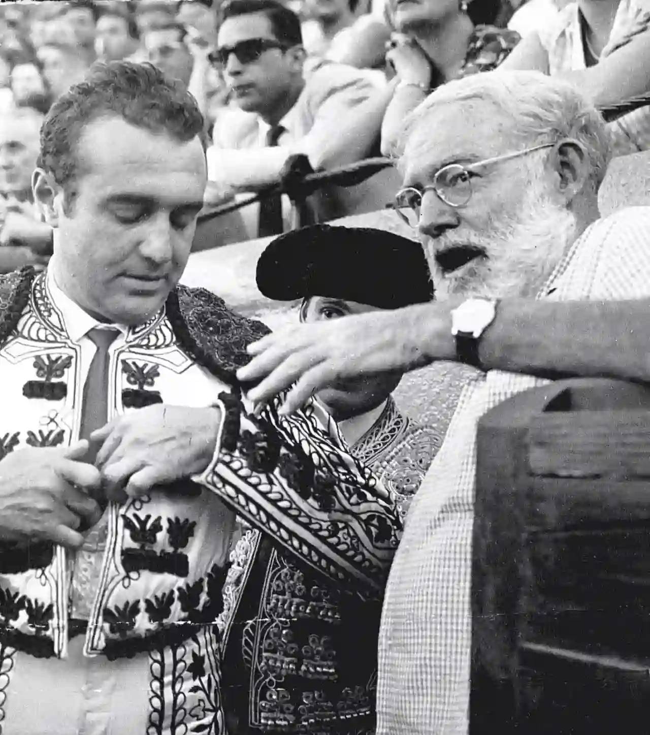 1960年,西班牙马德里的斗牛比赛开始前,美国作家海明威(右)与一名斗牛士交谈