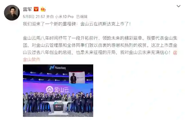 5月8日晚间,雷军通过个人微博发文祝贺金山云上市,“我们迎来了一个新的里程碑:金山云在纳斯达克上市了!”