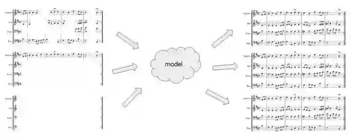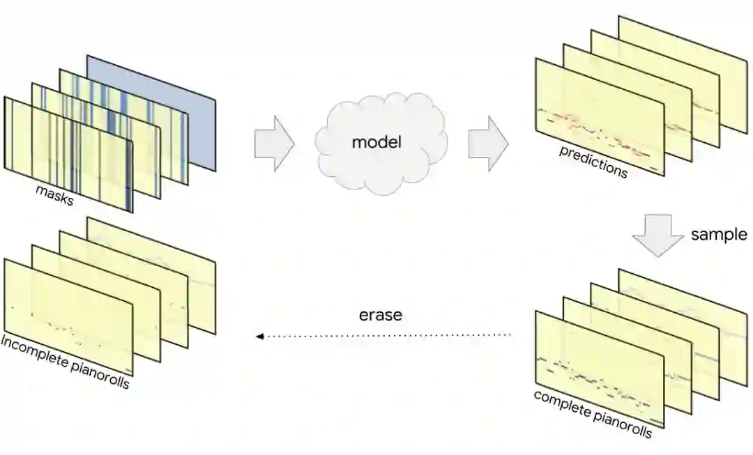 考虑这些相互作用的一种方法是对其中一个音高进行采样,将其添加到不完整的乐谱,并再次通过模型传递结果以重新计算剩余音高的分布。通过重复此过程直到确定所有音高,他们在考虑所有交互的同时完成乐谱,该顺序采样程序期望模型能够一个接一个地准确地确定未知的音高。