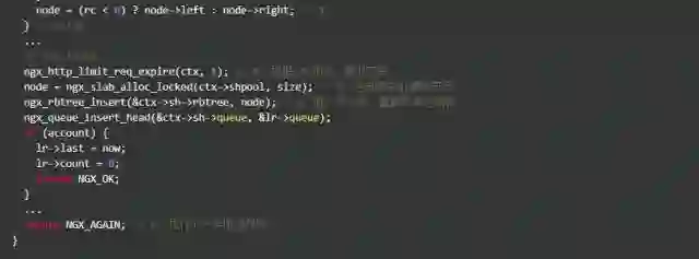 上述代码受限算出当前key上遗留的请求数,如果超过了burst,就直接拒绝;由于Nginx允许多条限速规则同时起作用,如果已是最后一条规则,则允许通过,否则执行下一条规则。