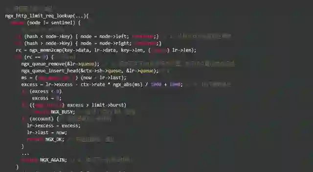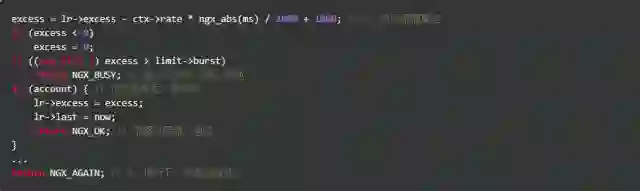 漏桶算法的实现也比我们想象的简单,其核心是这一行公式excess = lr->excess - ctx->rate * ngx_abs(ms) / 1000 + 1000,这样代码的意思是:excess表示当前key上遗留的请求数,本次遗留的请求数 = 上次遗留的请求数 - 预设速率 X 过去的时间 + 1。这个1表示当前这个请求,由于Nginx内部表示将单位缩小了1000倍,所以1个请求要转换成1000。