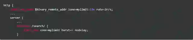 使用limit_req_zone关键字,我们定义了一个名为mylimit大小为10MB的共享内存区域(zone),用来存放限速相关的统计信息,限速的key值为二进制的IP地址($binary_remote_addr),限速上限(rate)为2r/s;接着我们使用limit_req关键字将上述规则作用到/search/上。burst和nodelay的作用稍后解释。