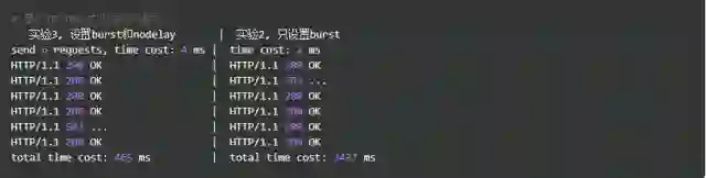 跟实验2相比,请求成功率没变化,但是总体耗时变短了。这怎么解释呢?实验2中,有4个请求被放到burst队列当中,工作进程每隔500ms(rate=2r/s)取一个请求进行处理,最后一个请求要排队2s才会被处理;实验3中,请求放入队列跟实验2是一样的,但不同的是,队列中的请求同时具有了被处理的资格,所以实验3中的5个请求可以说是同时开始被处理的,花费时间自然变短了。