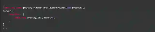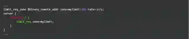 按请求速率限速是指限制单个IP(或者其他的key)发送请求的速率,超出指定速率后,Nginx将直接拒绝更多的请求。采用leaky bucket算法实现。为深入了解这个模块,我们先从实验现象说起。开始之前我们先简单介绍一下该模块的配置方式,以下面的配置为例: