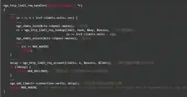我们看到ngx_http_limit_req_handler()调用了函数ngx_http_limit_req_lookup(),并根据其返回值决定如何操作:或是拒绝,或是交给下一个handler处理,或是将请求放入定期器队列。当限速规则都通过后,该hanlder通过调用函数ngx_http_limit_req_account()得出当前请求需要的延迟时间,如果不需要延迟,就将请求交给后续的handler进行处理,否则将请求放到定时器队列里。注意这个定时器队列是共享的,并没有为单独的key(比如,每个IP地址)设置队列。关于handler模块背景知识的介绍,可参考Tengine团队撰写的Nginx开发从入门到精通。