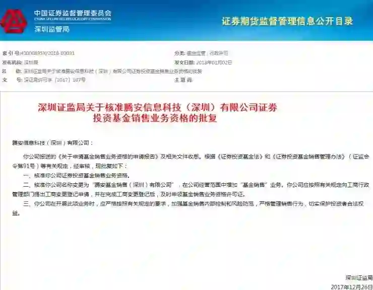雷锋网消息,据证监会公开信息披露,深圳证监局已于近日发布关于核准腾安信息科技(深圳)有限公司证券投资基金销售业务资格的批复。批复原文中显示,腾安公司将更名为腾安基金销售(深圳)有限公司,允许在公司经营范围中增加“基金销售”业务。