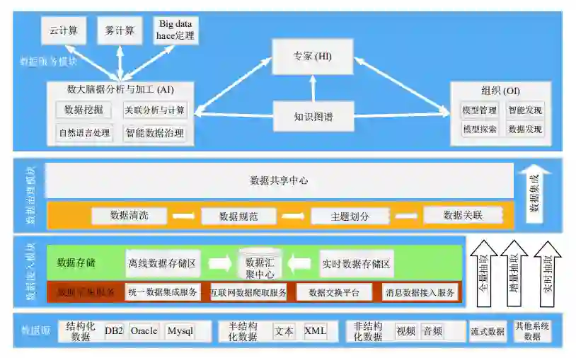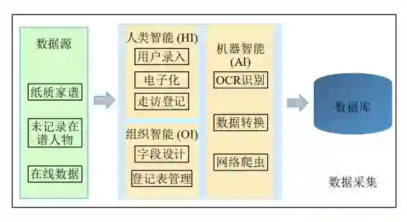 此外,以华谱系统为例,这篇文章整体介绍了关于「数据中台」的定义、功能模块、关键技术、挑战问题以及相应的解决方案。研究者利用知识图谱构建和推理技术,从海量家谱数据采集、汇聚开始,在数据治理、数据开发、数据资产管理等模块建设过程中辅以 「HI」 (人类智能)、 「AI」 (人工智能) 和 「OI」 (组织智能) 三者的交互和协同,创建了一个标准、可复用的家谱数据中台架构。