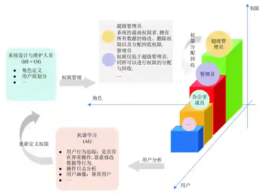 如上图所示,基于 HAO 模型的用户权限管理闭环架构的主要流程为: 由领域专家 (HI) 和组织智能 (OI) 设计用户的权限体系, 由人类专家 (HI) 审核后在权限控制中心提供接口, 最后基于日志的智能分析 (AI) 提供权限调整方面的反馈, 并再由 HI 或 OI 审核、优化 。其中, 为了实现闭环权限控制,系统应实时地采集、存储用户行为数据和用户操作数据,并设计智能的日志分析算法。