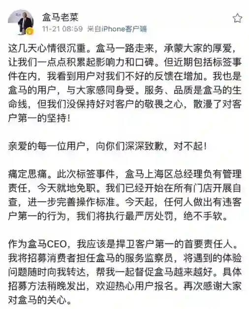 18.盒马CEO就“标签门”致歉:上海区总经理免职,邀用户参与监督