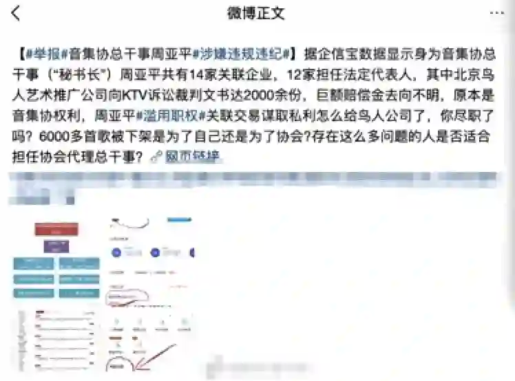 近日,有网友贴出材料直指周亚平“滥用职权、谋取私利”,“音集协代理总干事周亚平共有14家关联企业,12家担任法定代表人,其中北京鸟人艺术推广公司(由周亚平控股并担任法人代表)向KTV诉讼裁判文书达2000余份,巨额赔偿金去向不明,原本是音集协的权利,怎么给鸟人公司了?”