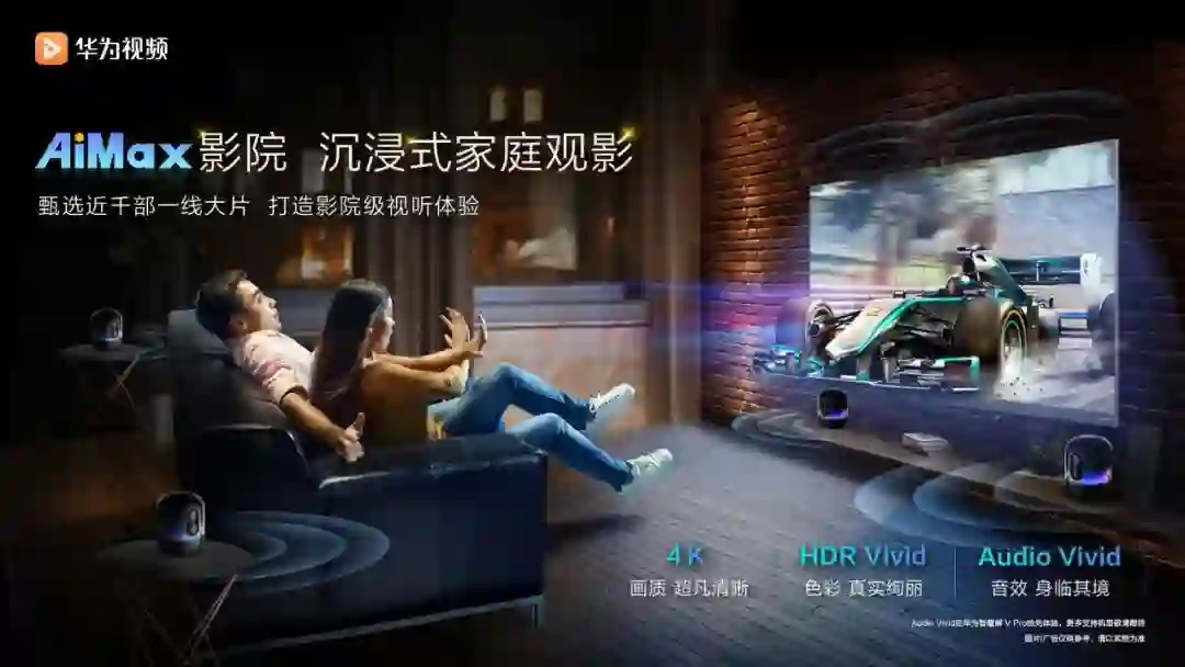 在家庭观影场景方面,华为视频提供的高质量视听服务品牌AiMax,采用4K+HDR+5.1声道业内领先的内容质量标准作为准入标准,在此基础上,部分影片支持HDR Vivid和Audio Vivid标准。通过提升影音作品的画质、色彩和音效,并适配终端设备呈现,使影音作品画质超凡清晰,纤毫毕现;色彩更真实,明暗细节更丰富,还原人眼所见的效果;并且让声音在观众四周活起来,感受到它们的方位和层次,实现惊艳的真实感,带来沉浸式观影体验。