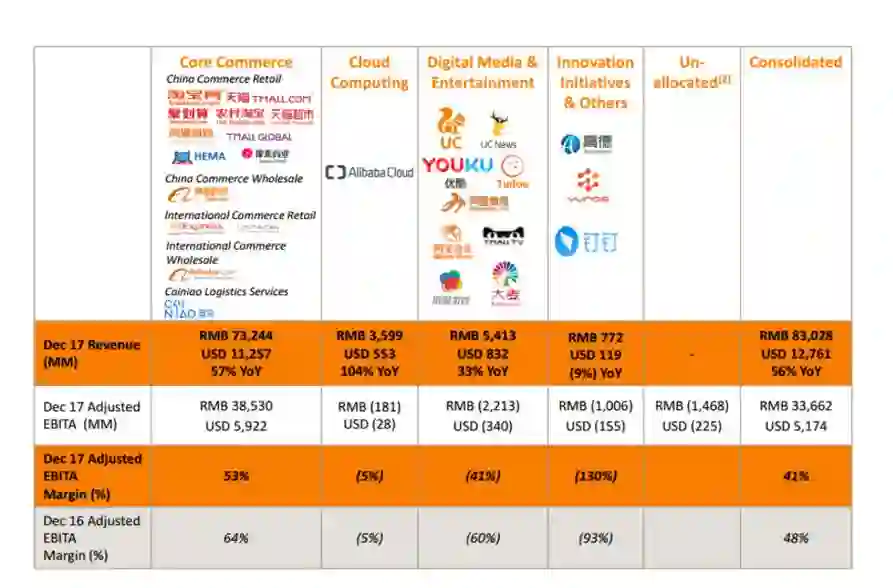 那么由面,如何形成体呢?同样是阿里巴巴这个例子。虎嗅网曾报道过 2017 年阿里 Q4 财报,披露业务板块如图所示: