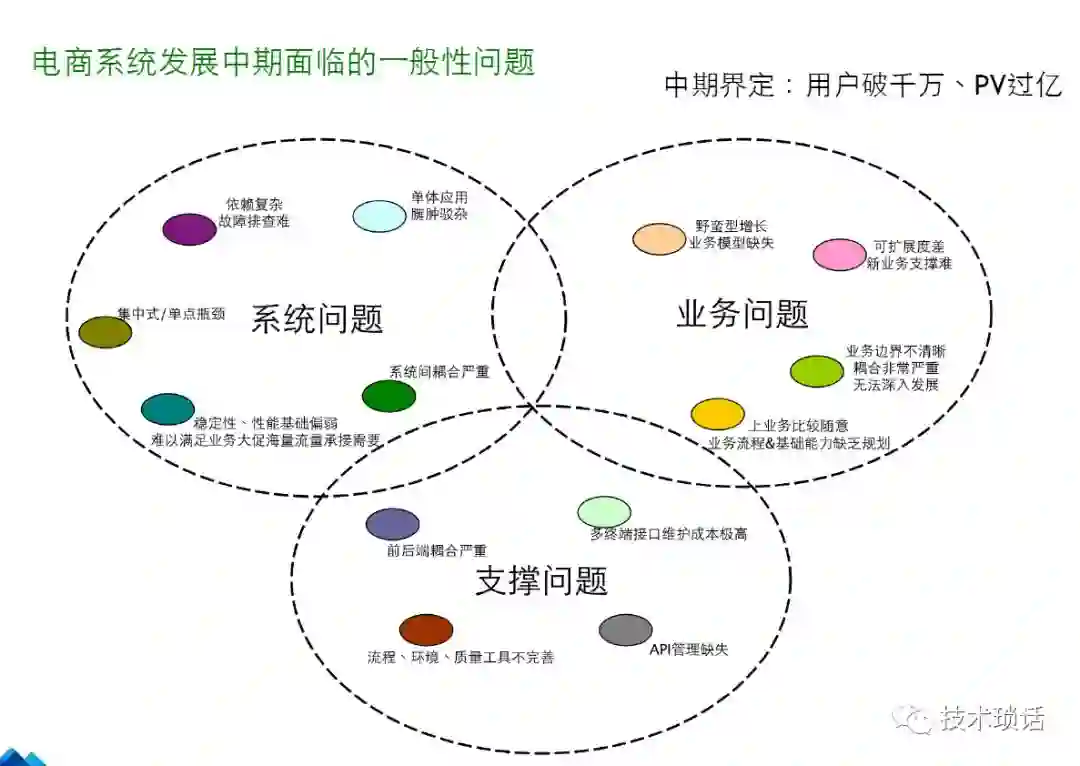 我们可以看一个例子,电商系统发展面临的问题。包括有有系统问题、业务问题、技术支持问题。