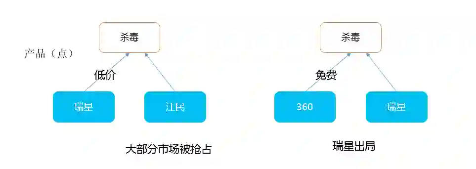 首先瑞星通过低价干掉了江民、而 360 通过免费干掉了瑞星。注意划重点,这 2 场战役都是“点”上的竞争,这个点就是杀毒软件。瑞星在专注杀毒产品的基础上未形成面和体的产品体系。